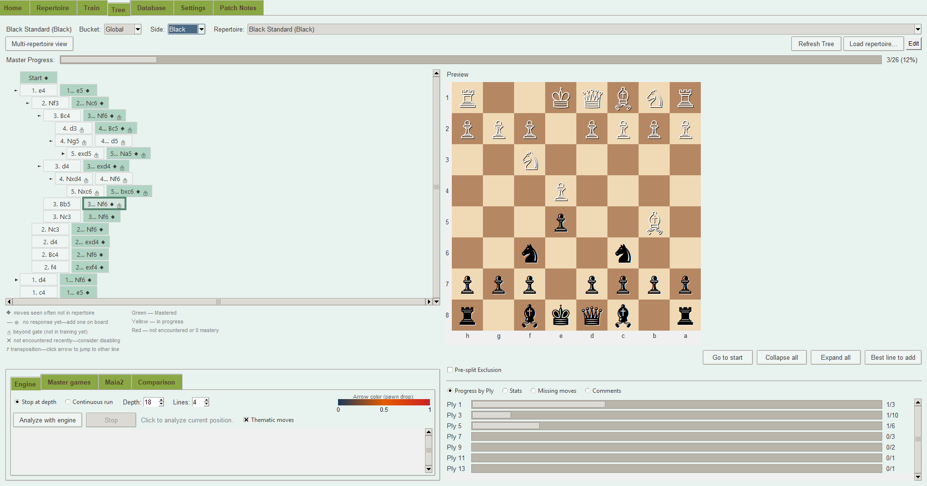 - Right: Progress by Ply, Stats, Missing moves, or Comments.