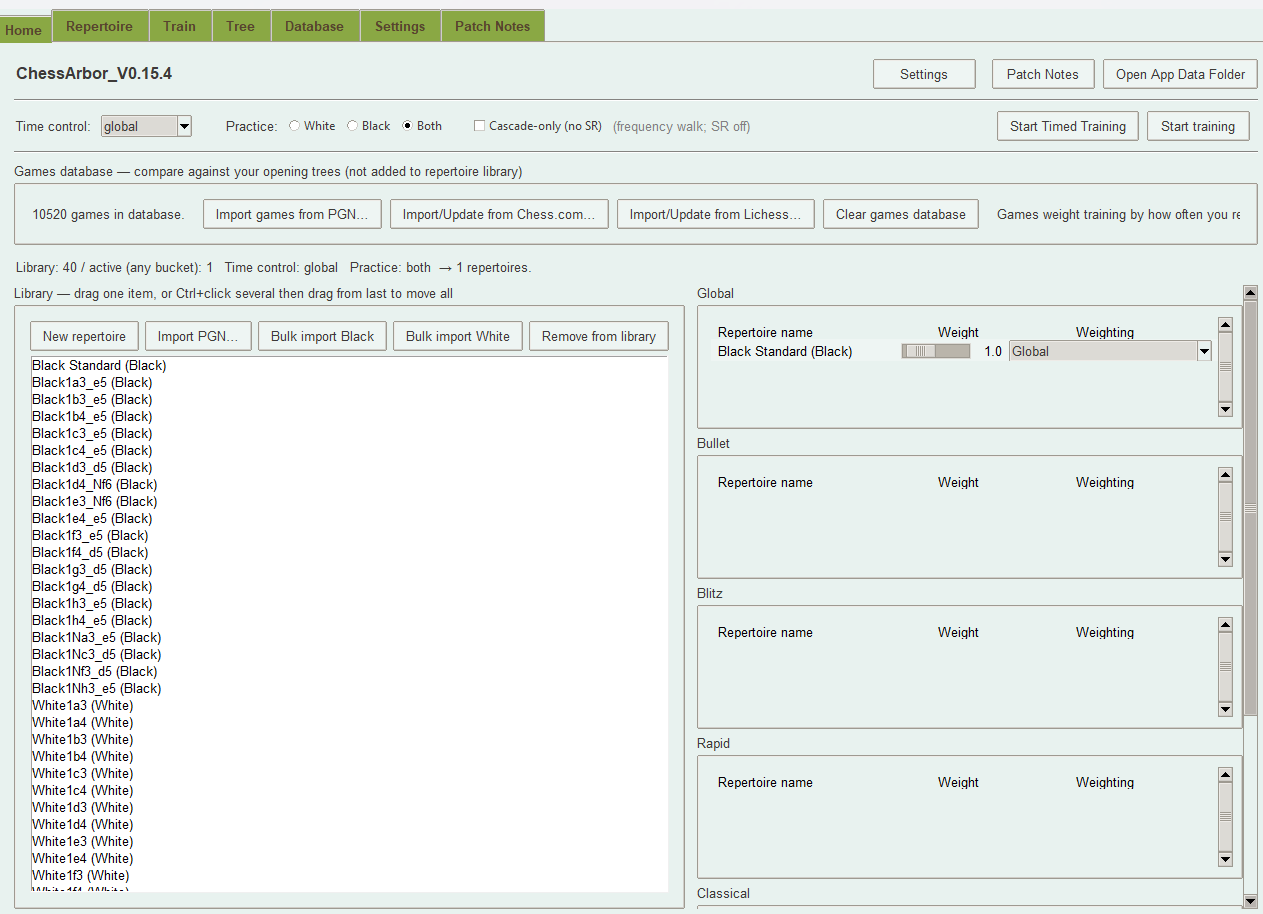 Time Control and Practice - Choose time control: Global, Bullet, Blitz, Rapid, Classical, or Daily. This selects which repertoires and games are used for training. - Choose practice side: White, Black, or Both. - Optional cascade-only mode: frequency-based walk without spaced repetition. Games Database - Import games from PGN, Chess.com, or Lichess (by username). - Games are separate from your repertoire library. They help prioritize lines you reach most often in real play, surface missing moves in the Tree, and sync mastery when you play wrong moves in games. - Clear games database to remove all imported games. Library and Buckets - Library: all repertoires. Add via Import PGN, Bulk import Black/White, or New repertoire. - Buckets: Global, Bullet, Blitz, Rapid, Classical, Daily. Drag repertoires from Library into a bucket to make them active for that time control. - Right-click a repertoire: Train now, Export PGN, or Remove from bucket. Bucket Rows - Weight (0.5–5.0): higher = chosen more often when multiple repertoires are active. - Weighting: Global (effective game count), Time control based, Uniform, or Standard spaced repetition. Start Training - Start training — untimed practice. - Start Timed Training — per-move countdown; timeout counts as a wrong move.