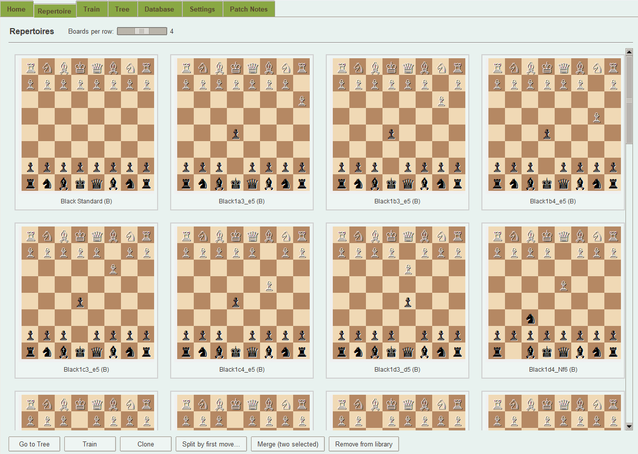 Board Grid - Each repertoire is shown as a chess board displaying the first split position — the last position before your opponent has multiple options (e.g., Ruy Lopez shows position after 3.Bb5). - Boards oriented with your side at the bottom. - Scale: adjust board size. - Scroll with mousewheel; click or Ctrl+click to select repertoires. Actions - Clone — create a copy of a repertoire (PGN + training state) with a new name. - Split by first move — extract lines that start with a chosen first move into a new repertoire. - Merge (two selected) — combine two repertoires (same side) into one. - Remove from library — delete repertoire(s) from the library.